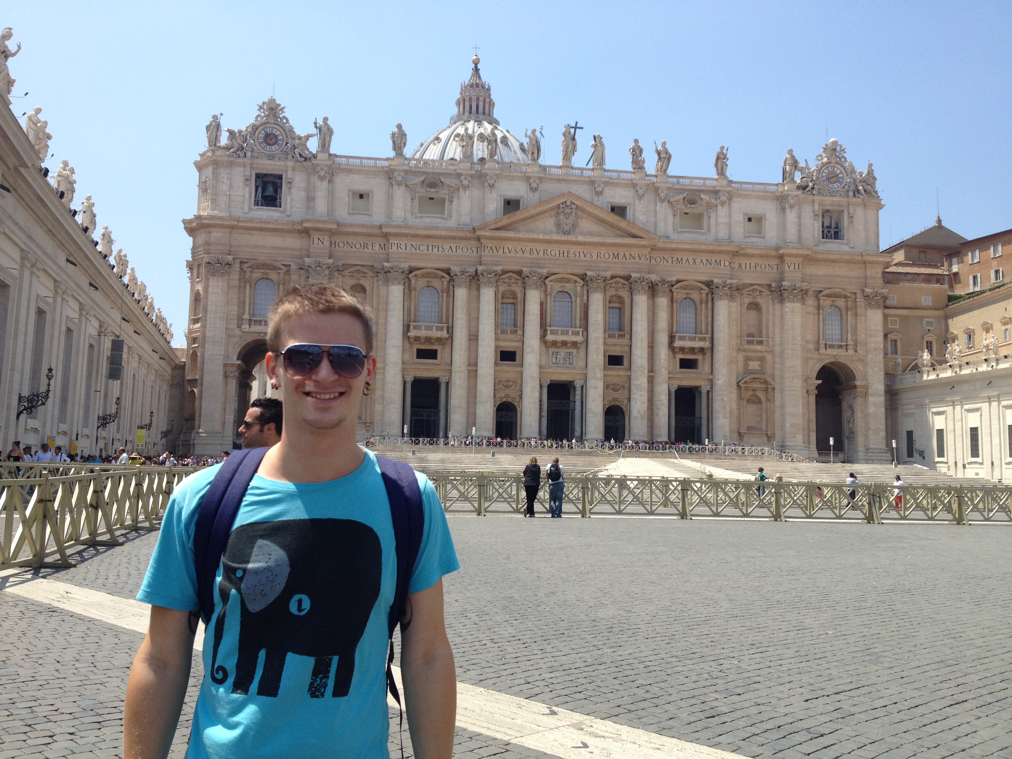 Personal reflection aside, the basilica is still rather wondrous to behold. A highlight is the statue of St Peter, whose toes on this right foot have been worn down to a smooth nub after centuries of pilgrims touching and kissing his foot while they pray to the saint. As I was taking a photo of the main alter in the church, I was tapped on the shoulder. I turned around to see a couple, a man a woman, extending their camera out to me and pointing at the alter. Figuring that they wanted me to take a picture for them, but also guessing that they didn’t speak English or Italian, I just smiled and nodded. I took the camera and snapped a few shots before handing it back to them, and then motioning for them to take a few for me in return. “спасибо,” (or phonetically ‘spasiba’) the man mumbled to me in a deep voice as we parted ways. I got momentarily excited, and went to say “You’re welcome”, until I realised that ‘thank you’ was pretty much the extent of all the Russian that I knew. After I had finished looking around and taking a few pictures, I exited St Peter’s Basilica through the underground crypts, where former Popes are laid to rest. It was a solemn route in which photography was not allowed, so after I left I snapped a few last pictures out the front in St Peter’s Square.