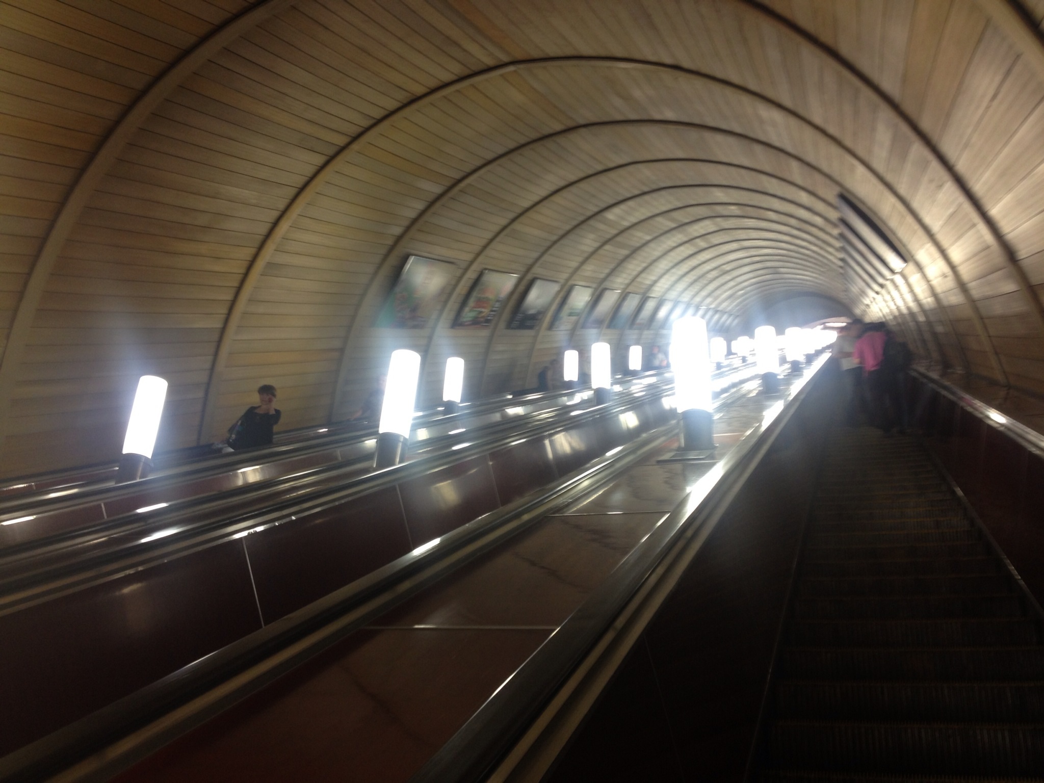The long, cavernous escalator tunnel in one of the Moscow Metro stations.